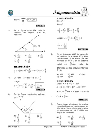 1. El documento presenta problemas de trigonometría relacionados con sistemas de medida angular, conversiones entre grados sexagesimales y centesimales, cálculo de ángulos dados información parcial, y relaciones entre medidas angular en diferentes sistemas. 2. Se resuelven 15 problemas que implican aplicar conceptos trigonométricos básicos como suma y diferencia de ángulos, relaciones entre radianes, grados y minutos. 3. Los problemas van desde conversiones simples hasta relaciones más complejas entre medidas angular en diferentes sistemas.