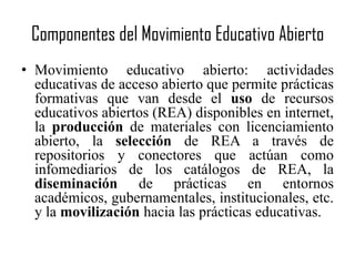 Este documento presenta un resumen de un curso sobre innovación educativa con recursos abiertos. Describe los componentes del movimiento educativo abierto y las potencialidades de los recursos educativos abiertos. También presenta los antecedentes de una profesora de química en Uruguay y su interés en innovar el tema del equilibrio químico utilizando recursos educativos digitales.