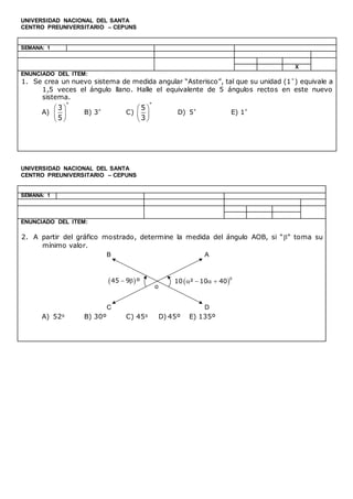 Este documento contiene dos problemas de matemáticas con sus respectivas soluciones. El primer problema introduce un nuevo sistema de medida angular llamado "asterisco" donde cada unidad equivale a 1.5 veces un ángulo recto, y pide calcular el equivalente de 5 ángulos rectos en este sistema. La segunda pregunta pide determinar el valor de un ángulo desconocido dado un gráfico y ecuaciones.