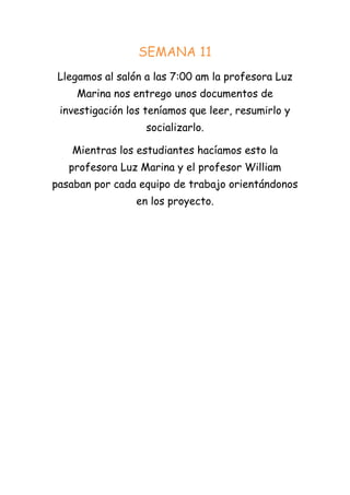 La profesora Luz Marina entregó documentos de investigación a los estudiantes para que los leyeran, resumieran y socializaran. Mientras los estudiantes trabajaban en esto, la profesora Luz Marina y el profesor William recorrieron cada equipo para orientarlos en sus proyectos.