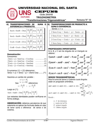 Este documento presenta varias identidades trigonométricas y sus demostraciones, incluyendo transformaciones de suma a producto, producto a suma, y propiedades de triángulos. También cubre series trigonométricas y problemas de clase para practicar estas transformaciones y propiedades.