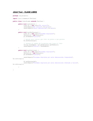 El documento describe las clases Libro, Persona y Biblioteca que modelan una biblioteca. La clase Libro almacena información sobre títulos, autores y personas a las que se prestan. La clase Persona almacena nombres y número máximo de libros. La clase Biblioteca gestiona listas de libros y personas, y métodos para préstamos, devoluciones y consultas. También incluye pruebas JUnit para cada clase.