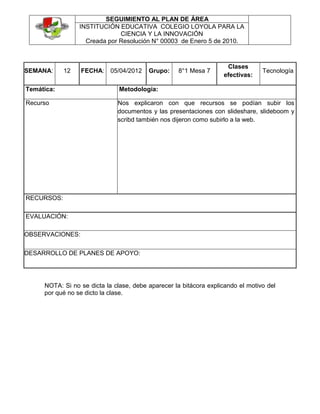 El documento presenta el seguimiento de un plan de área para la semana del 5 de abril de 2012 en la Institución Educativa Colegio Loyola para la Ciencia y la Innovación. La clase de esa semana en el grupo 8°1 se centró en explicar a los estudiantes los recursos que se pueden usar para subir documentos y presentaciones a sitios web como SlideShare, SlideBoom y Scribd.