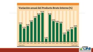 Este documento habla sobre cuentas macroeconómicas y sus indicadores. Explica que las cuentas nacionales proporcionan una perspectiva global de la economía a través de agregados como el Producto Bruto Interno. Luego describe algunos agregados macroeconómicos clave como el PBI nominal y real, así como indicadores como el PBI per cápita y la tasa de crecimiento del PBI. Finalmente, discute la relación negativa entre la tasa de paro y el PIB real de acuerdo a la Ley de Okun.
