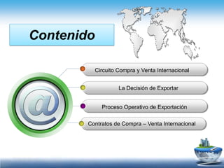 El documento explica las etapas y actividades del proceso de exportación. Primero, la empresa debe decidir exportar y analizar su capacidad para hacerlo. Luego, selecciona el mercado objetivo, determina los productos exportables y su clasificación arancelaria. Después, establece el precio, contacta importadores, cierra ventas y envía facturas. Finalmente, explica los requisitos para exportar, contratos comunes y términos que deben incluir como identificación de las partes, objeto, precio, pagos, entrega, transport