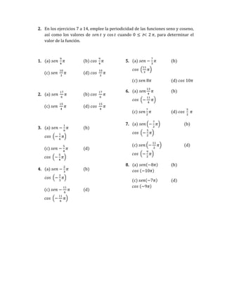 Este documento presenta una serie de ejercicios relacionados con el cálculo de funciones seno y coseno para diferentes valores de entrada. En los primeros 6 ejercicios se pide calcular el valor de sen y cos con 4 dígitos significativos usando una calculadora. Los ejercicios 7 a 14 implican usar la periodicidad de sen y cos para determinar valores cuando el ángulo es un múltiplo de 2π. Finalmente, los ejercicios 15 a 20 piden encontrar el período de diferentes funciones sen y cos.