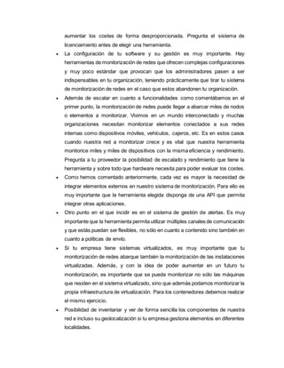 El documento describe las herramientas de monitorización de redes y los elementos clave a considerar para una evaluación correcta. Explica que Pandora FMS es una herramienta flexible que puede monitorizar cualquier dispositivo u organización, mientras que Nagios es una herramienta libre popular pero que ha perdido cuota de mercado. También analiza a Zabbix como una opción de código abierto que es potente pero que su rendimiento disminuye a partir de 1000 nodos.