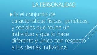 1) El documento trata sobre la personalidad y cómo se desarrolla según diferentes teorías psicológicas. 2) Aborda las teorías psicodinámicas de Freud, Jung, Adler y Horney, así como las teorías humanistas de Rogers y las teorías de los rasgos. 3) También analiza factores como las expectativas, la autoeficacia y el locus de control según la perspectiva cognitivo-social.