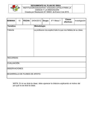 La bitácora documenta una clase de la semana 15 del 24 de abril de 2012 para el grupo 8°1 Mesa 7. La profesora explicó lo que faltaba de su clase anterior sobre el tema de Faltante. No se proporcionan detalles sobre los recursos, evaluación u observaciones. No se dictó un plan de apoyo.