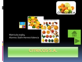 El documento presenta información sobre la empresa Citricos S.A., incluyendo su misión de ser líder global en cítricos frescos mediante la calidad, seguridad alimentaria y servicio al cliente. Describe que participa en proyectos de investigación de nuevas variedades y adquisición de tierras para cultivo. También incluye secciones sobre el blog de la empresa, su organigrama, un evento navideño y detalles sobre sus principales productos de naranjas y su estado de resultados suponiendo ventas.