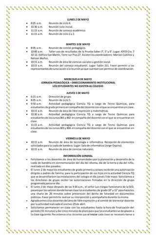 El documento presenta el cronograma de actividades y acompañamiento de estudiantes para la semana del 2 al 6 de mayo en el Colegio María Mercedes Carranza. Incluye horarios de reuniones, jornadas pedagógicas, actividades extracurriculares y de alimentación, así como instrucciones generales para docentes.