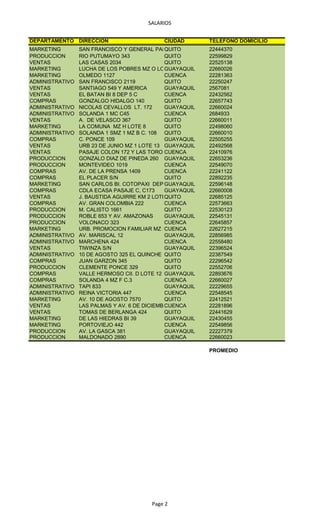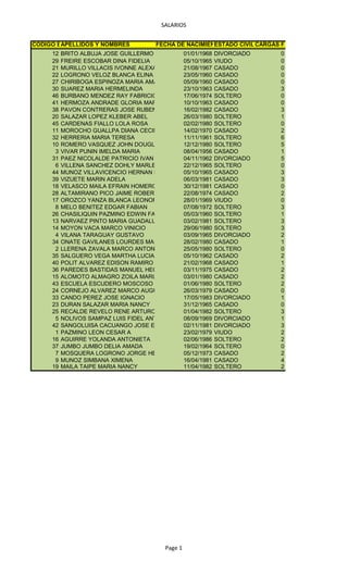 Este documento presenta una lista de empleados de una empresa con sus datos personales como nombre, fecha de nacimiento, estado civil, cargos familiares, departamento, dirección, teléfono y salario. Contiene información de 45 empleados con sus respectivos salarios que van desde los S/. 100 hasta los S/. 980. El promedio de salarios de todos los empleados es de S/. 486.04.