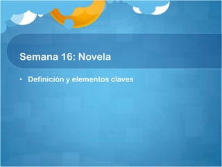 La novela es un subgénero narrativo que se caracteriza por ser una narración extensa en prosa que describe eventos reales o imaginarios e incluye muchos personajes y descripciones detalladas. A través de la Edad Media, el Renacimiento, el Romanticismo, el Realismo y el Naturalismo, la novela evolucionó como forma literaria, consolidándose con obras como "El ingenioso hidalgo Don Quijote de la Mancha" de Cervantes. La novela moderna se distingue de formatos como la telenovela en que se presenta a través