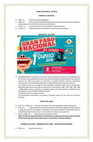 El documento presenta el cronograma de actividades para la semana del 30 de mayo al 3 de junio en el Colegio María Mercedes Carranza. Incluye los horarios de acompañamiento de estudiantes al ingreso, descanso y salida, reuniones de docentes, actividades de convivencia, paro nacional del miércoles, e información sobre el horario del comedor y los centros de interés del programa de talentos.