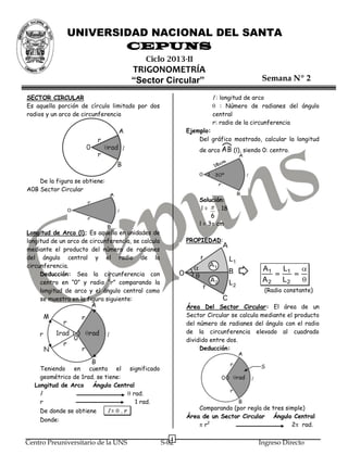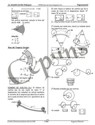 Este documento presenta conceptos básicos de trigonometría sobre sectores circulares, incluyendo la longitud de arco, el área de un sector circular, el número de vueltas de una rueda, y resuelve ejercicios numéricos relacionados.