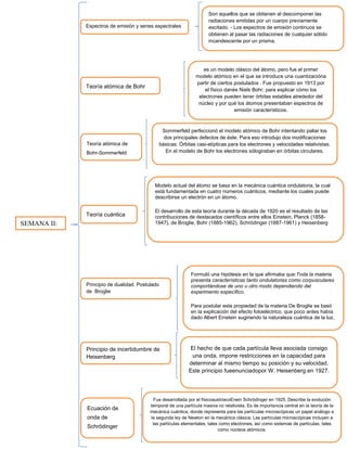 Los espectros de emisión son espectros obtenidos al descomponer las radiaciones emitidas por un cuerpo previamente excitado. La teoría atómica de Bohr explica cómo los electrones pueden tener órbitas estables alrededor del núcleo y por qué los átomos presentaban espectros de emisión característicos. La teoría cuántica, desarrollada en la década de 1920, se basa en la mecánica cuántica ondulatoria y está fundamentada en cuatro números cuánticos.