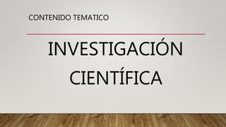 El documento habla sobre la investigación científica. Define la investigación como una actividad sistemática para obtener conocimientos y resolver problemas. Explica que hay dos tipos principales: investigación básica, cuyo objetivo es desarrollar teoría, e investigación aplicada, que busca aplicar los conocimientos. También clasifica la investigación por su método, nivel de conocimiento y propósito.