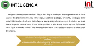 El documento presenta la teoría de las inteligencias múltiples de Howard Gardner, la cual propone que la inteligencia no es un concepto unitario sino múltiple. Gardner identificó 8 tipos de inteligencia: lingüística, lógico-matemática, espacial, corporal-kinestésica, musical, interpersonal, intrapersonal y naturalista. El desarrollo de cada inteligencia depende de factores biológicos, personales y culturales/históricos. Se pide a los estudiantes elaborar un mapa mental sobre