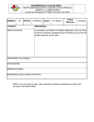 Este documento resume el seguimiento de un plan de área para la semana del 31 de julio de 2012 en la Institución Educativa Colegio Loyola para la Ciencia y la Innovación. Se enseñó el marco contextual fuera del salón debido al calor y se usaron carpetas como recurso. No hubo evaluación ni desarrollo de planes de apoyo.