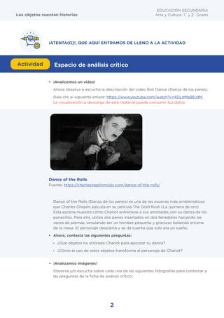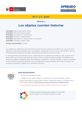 Este documento presenta una actividad educativa sobre el uso de objetos cotidianos para contar historias. Los estudiantes analizarán imágenes y un video que usan objetos de manera metafórica y creativa. Luego, deben seleccionar objetos de su casa para representar personajes y filmar un teatro de objetos de 2 minutos contando una historia basada en una experiencia personal. Al final, reflexionarán sobre lo aprendido y compartirán su video.