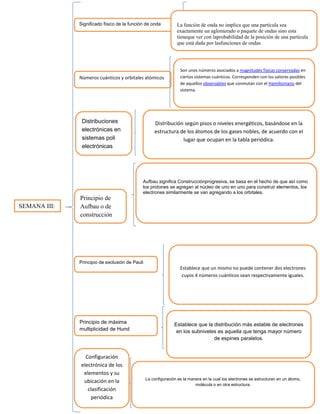 Este documento contiene información sobre varios principios y conceptos cuánticos relacionados con la estructura atómica. Explica que la función de onda se relaciona con la probabilidad de posición de una partícula y no implica que sea una onda. También describe los números cuánticos, las distribuciones electrónicas, el principio de Aufbau, el principio de exclusión de Pauli, el principio de máxima multiplicidad de Hund y cómo la configuración electrónica determina la ubicación de los elementos en la tabla periódica.
