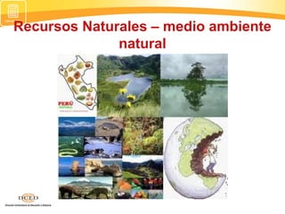 Este documento presenta información sobre los recursos naturales y el medio ambiente natural en Perú. Explica que los recursos naturales son bienes y servicios proporcionados por la naturaleza que son valiosos para las sociedades humanas. Se clasifican los recursos naturales en renovables, no renovables y potenciales. Luego describe algunos recursos naturales importantes de Perú como el petróleo, gas natural, minerales y el mar peruano. También cubre conceptos como el medio ambiente natural, relieve terrestre y clima del país.