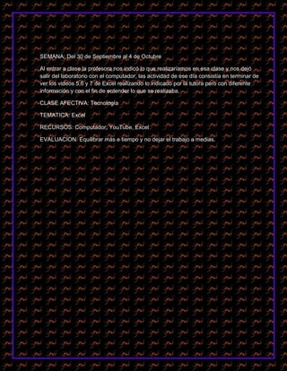 La profesora indicó que la clase consistiría en terminar de ver videos 5, 6 y 7 de Excel, realizando las actividades indicadas por la tutora pero con información diferente, con el fin de entender cómo funciona Excel. La clase trató sobre tecnología y la temática fue Excel. Los recursos incluyeron computadoras, YouTube y Excel. La evaluación fue equilibrar mejor el tiempo y no dejar trabajos a medias.