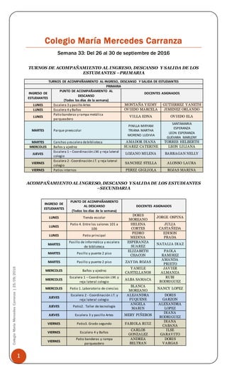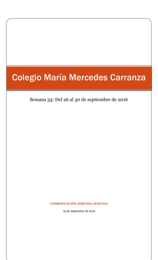 Este documento presenta la coordinación de actividades para la semana del 26 al 30 de septiembre en el Colegio María Mercedes Carranza. Incluye los turnos de docentes para acompañamiento de estudiantes, reuniones programadas, aplicación de la prueba Saber, información sobre el comedor escolar y eventos como las comisiones de evaluación y el foro educativo local.