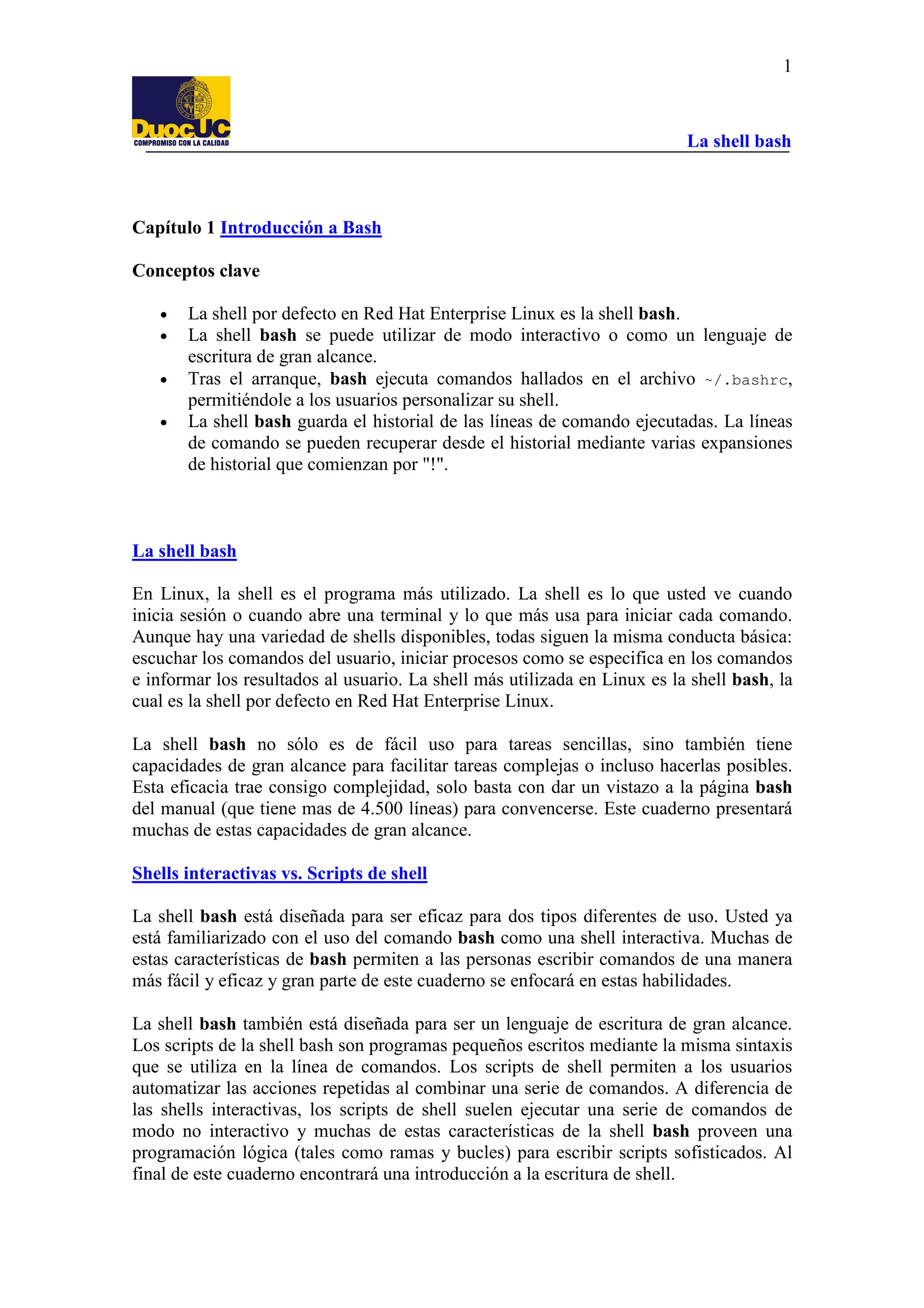 El documento proporciona una introducción a la shell bash en Linux. La shell bash es la shell predeterminada en Red Hat Enterprise Linux y puede usarse de forma interactiva o para escribir scripts. Mantiene un historial de comandos que permite recuperar y editar comandos anteriores. Los usuarios pueden personalizar su shell bash editando el archivo ~/.bashrc.