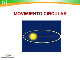 El documento describe conceptos relacionados con el movimiento circular como posición angular, velocidad angular, aceleración centrípeta, periodo y frecuencia. Explica las ecuaciones que relacionan estas cantidades para movimiento circular uniforme y uniformemente acelerado. Proporciona ejemplos y ejercicios para aplicar estos conceptos.