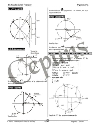 Este documento presenta conceptos básicos de trigonometría. Define la circunferencia trigonométrica y las líneas trigonométricas como segmentos que representan los valores de las razones trigonométricas. Explica la variación periódica del seno, coseno, tangente, cosecante, secante y cotangente. Resuelve problemas aplicando estas definiciones y propiedades trigonométricas.