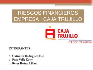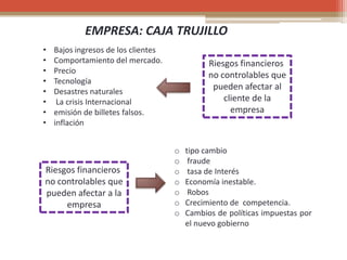 Este documento describe los diferentes riesgos financieros que pueden afectar a la empresa Caja Trujillo, incluyendo riesgos no controlables como cambios en el tipo de cambio o la economía, y riesgos controlables como riesgo de liquidez o rotación de personal. También presenta estrategias para mitigar los riesgos controlables, como contar con una aseguradora o establecer políticas de crédito.