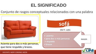 El documento presenta diferentes tipos de relaciones semánticas entre palabras como la polisemia, homonimia, hiperonimia, meronimia, sinonimia y antonimia. También explica los vicios del lenguaje como la cacofonía, ambigüedad, redundancia y barbarismos. Finalmente, ofrece ejemplos de palabras que ilustran cada una de estas relaciones semánticas y vicios del lenguaje.