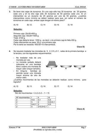 Este documento presenta las soluciones a ejercicios de matemáticas de una clase preuniversitaria. Contiene 14 ejercicios con sus respectivas soluciones paso a paso. El objetivo es practicar habilidades lógico-matemáticas mediante problemas de álgebra, geometría y teoría de números.