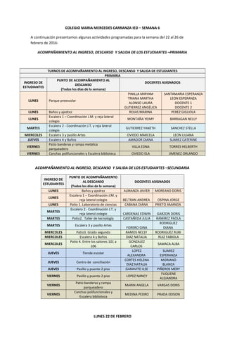 Este documento presenta el cronograma de actividades para la semana del 22 al 26 de febrero en el Colegio María Mercedes Carranza. Incluye los turnos de acompañamiento de estudiantes durante el ingreso, descanso y salida, así como reuniones de diferentes áreas y ciclos. También presenta el horario de ingreso al comedor escolar y las actividades para el ciclo inicial de 6:15 a 11:45 a.m. diariamente.