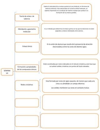 El documento explica la naturaleza de los enlaces químicos en términos de valencias atómicas y teoría orbital molecular. Específicamente, señala que la máxima superposición de orbitales conduce a la formación de los enlaces posibles entre átomos y que la hibridación determina la geometría molecular. También describe el enlace iónico como la unión electrostática entre iones de carga opuesta y las propiedades de los compuestos iónicos como sólidos cristalinos ordenados con puntos de fusión elev