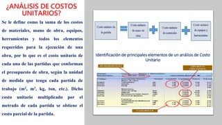 Este documento describe los componentes clave de un análisis de costos unitarios para proyectos de ingeniería civil. Explica que un análisis de costos unitarios determina el costo de cada partida de trabajo dividiendo el costo total por la unidad de medida como metros cúbicos o metros cuadrados. Luego detalla los parámetros para calcular los costos unitarios de la mano de obra, los materiales, las herramientas y los equipos, como la cuadrilla necesaria, el aporte unitario y los precios de cada recurso.