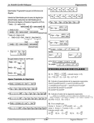 Este documento presenta las identidades trigonométricas para ángulos compuestos y diferencias de ángulos. Inicia demostrando las identidades fundamentales de Sen(α + β), Cos(α + β) y Tg(α + β). Luego, deduce las identidades para la diferencia de ángulos usando estas demostraciones. Finalmente, enlista algunas propiedades importantes de las identidades trigonométricas. El documento concluye con ejemplos numéricos para practicar.