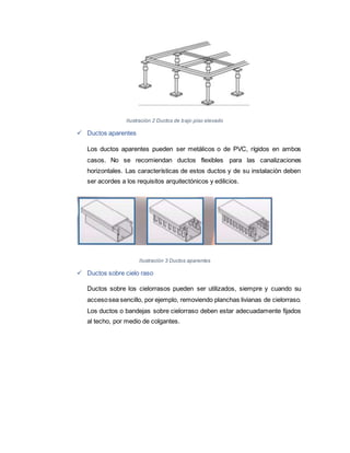 Este documento describe diferentes tipos de canalizaciones y accesorios para el cableado de datos, incluyendo ductos de bajo piso, ductos elevados, ductos aparentes, bandejas, y canalizaciones verticales y horizontales. También cubre salas de telecomunicaciones y canalizaciones externas subterráneas, enterradas, en túneles, y aéreas.