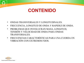 Este documento presenta información sobre ondas mecánicas transversales y longitudinales. Explica conceptos clave como frecuencia, longitud de onda, rapidez de onda y cómo se relacionan. También cubre temas como ondas estacionarias, frecuencias características y cómo calcular la energía y potencia de una onda. Finalmente, presenta ejemplos numéricos para ilustrar los conceptos.