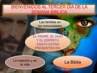 Este documento resume el tercer día de la Semana Bíblica, enfocándose en Jesús, María y José. Resalta que la Sagrada Familia experimentó persecución pero permaneció unida confiando en Dios, y que a los 12 años Jesús se quedó en el templo aprendiendo de su Padre antes de continuar creciendo en sabiduría y gracia con sus padres.