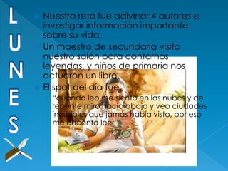 El documento resume las actividades de un día en la escuela relacionadas con la lectura, incluyendo adivinar autores, escuchar leyendas de un maestro visitante, mejorar la velocidad lectora, ver una obra de teatro de Pinocho, recibir una conferencia sobre la vida, y escuchar cuentos de un cuentacuentos invitado.