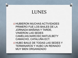 El documento describe las actividades realizadas durante una semana cultural en una institución educativa, incluyendo bailes, juegos, feria empresarial, experimentos científicos y concursos de baile y canto para cerrar la semana. Cada día se llevaron a cabo diferentes eventos organizados por los estudiantes y docentes.