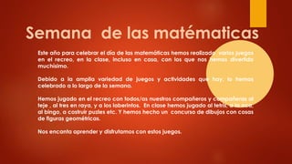 La semana de las matemáticas incluyó diversos juegos y actividades en recreos y clases, promoviendo el aprendizaje divertido. Se organizaron concursos de dibujo y fotografía, cuyas obras ganadoras serán expuestas en la página web del centro. Los estudiantes disfrutaron de juegos como el tres en raya, tetris y puzles para aprender matemáticas.