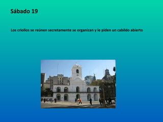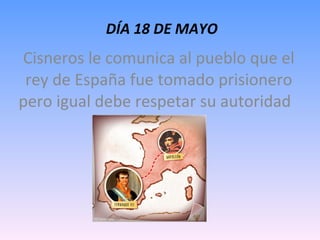 El 18 de mayo, Cisneros informó al pueblo que el rey de España había sido capturado pero que aún debían respetar su autoridad. Los criollos se reunieron en secreto los días 19 y 21 de mayo para pedir un cabildo abierto. El 22 de mayo se realizó el cabildo abierto para discutir la destitución de Cisneros como virrey. El 23 de mayo se contaron los votos y se decidió formar una Junta de Gobierno presidida por Cisneros, pero el pueblo no estuvo de ac