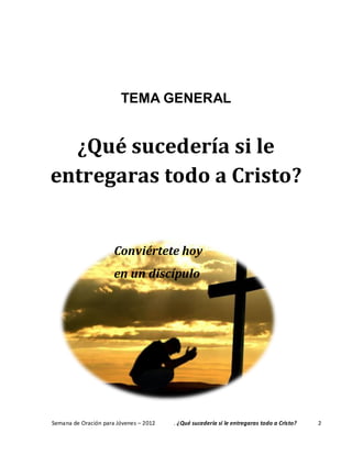 La Semana de Oración 2012 para jóvenes se centra en la temática de entregarse completamente a Cristo y convertirse en discípulos. Se presentan sermones que abordan aspectos fundamentales de la fe cristiana, enfatizando el amor incondicional de Dios, la necesidad de una relación personal con Jesucristo y la transformación a través del Espíritu Santo. Se invita a los jóvenes a reflexionar sobre su relación con Jesús y el impacto que puede tener en sus vidas y comunidades al entregarse a Él.