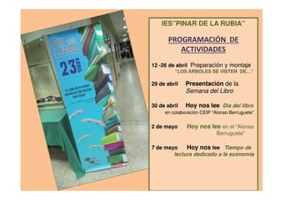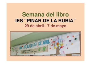 El documento describe las actividades de la Semana del Libro que se llevará a cabo en el IES "PINAR DE LA RUBIA" del 29 de abril al 7 de mayo. Se presentarán diferentes actividades como la decoración de árboles con poemas, libros, canciones y sentimientos y se leerá en colaboración con un colegio cercano. Cada nivel educativo decorará un árbol con un tema literario diferente. El objetivo es fomentar el amor por la lectura entre alumnos, tutores, profesores y