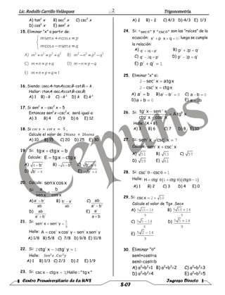 Este documento presenta 30 problemas de trigonometría que involucran identidades trigonométricas y sus aplicaciones. Los problemas incluyen calcular valores dados expresiones trigonométricas, reducir expresiones, eliminar variables y resolver sistemas de ecuaciones trigonométricas. El documento parece ser parte de un examen sumativo para un curso de trigonometría a nivel preuniversitario.