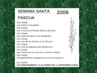 El documento habla sobre las celebraciones de Semana Santa, incluyendo Domingo de Ramos, Jueves Santo, Viernes Santo y Sábado Santo. Destaca que el Viernes Santo se realizará el Vía Crucis por las calles del barrio, comenzando y finalizando en el templo, y pide a los asistentes que traigan una cruz de su casa para llevar junto a Jesús.