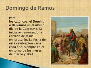 Este documento resume las principales celebraciones de la Semana Santa en la religión católica, incluyendo el Domingo de Ramos, el Jueves Santo, el Viernes Santo, la Vigilia Pascual y la importancia de la resurrección de Cristo para los cristianos.